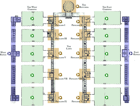 Jefferson’s description became the report of the commission when it approved Central College as the site for the new University. Jefferson’s design featured a wide expanse of lawn, flanked by two parallel rows of buildings. At intervals in the rows Jefferson set pavilions, two story structures which were occupied by the professors and where the students attended class. Between the pavilions were the student rooms which opened onto a colonnaded arcade that ran the length of the row and protected the students from the weather as they walked to the pavilions for class and meals. This design permitted the row to be extended for additional pavilions and student rooms as the population of the school increased. Parallel to these rows separated by gardens were the “ranges” of additional student rooms.