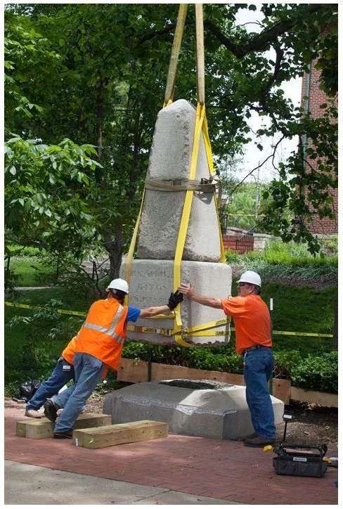 Workmen rotating the granite obelisk 180 degrees so the plaque faces toward Francis Quadrangle