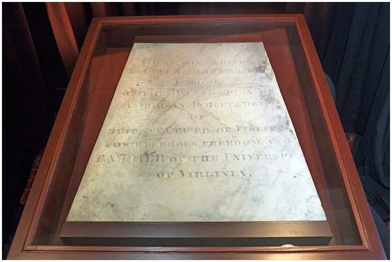 Jefferson himself wrote what he wanted written on the stone. Scholars find it interesting that he left out many of his other accomplishments, including (i) being the 3rd President of the United States (for 2 terms) during which he dispatched Lewis & Clark on the expedition to the Western Territory, (ii) having been the principal negotiator of the Louisiana Purchase (which nearly doubled the size of our young nation), (iii) serving as the Governor of Virginia, Ambassador to France, Secretary of State, and Vice President, (iv) having proposed using the decimal system for the U.S. currency, (vi) having proposed building an interstate highway system, (vii) founding the U.S. military academy at West Point, (viii) donating his personal library to the U.S. Government which became the nucleus of the Library of Congress, and (viii) his achievements in architecture, which involved helping design Washington, D.C., the Richmond state capitol, and Monticello, plus (ix) his love of antiques, music, gardening, scientific instruments and collections of natural history.