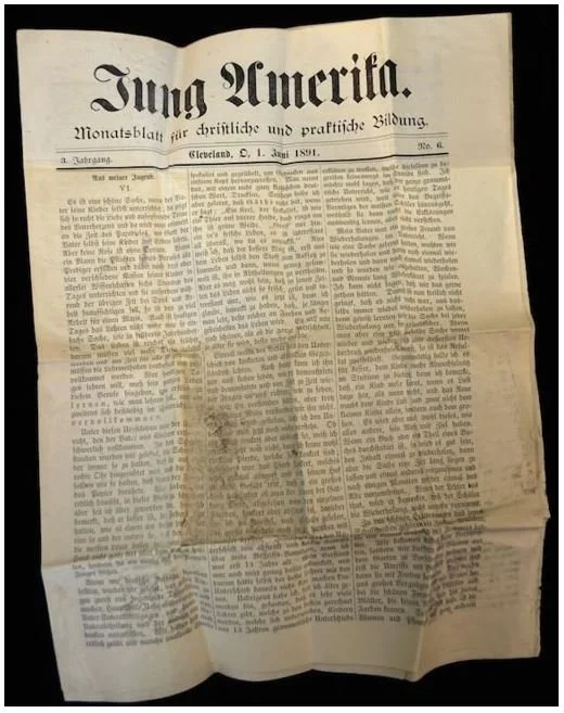 The June 1891 Cleveland newspaper, Jung Amerika, found under the plaque before shipping to the Smithsonian for restoration